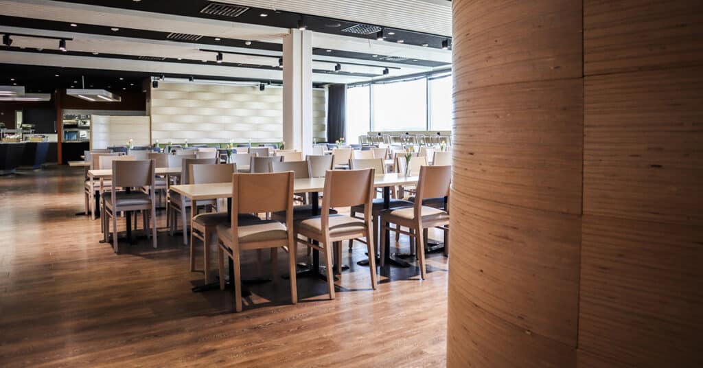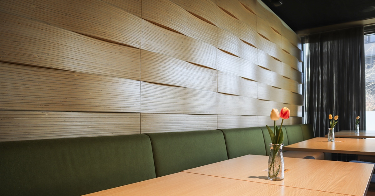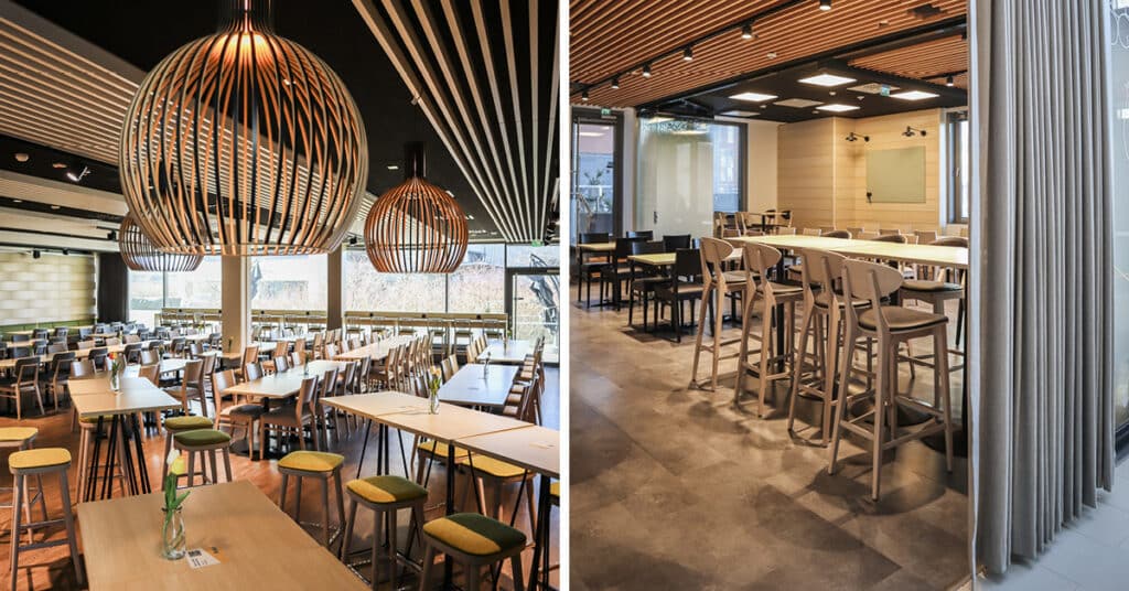 – Ravintoloiden sohvat ja pöytärungot on toteutettu kierrätetyistä materiaaleista, ja pöytäpinnat ovat kotimaista laminaattia. Vaaleat, aaltoilevat seinäpaneelit eivät ole vain kauniit – ne myös parantavat akustiikkaa ja saavat tilan tuntumaan väljemmältä, Paasonen kertoo.